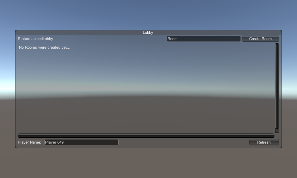 Hãy bắt đầu bằng cách tạo cảnh Sảnh sẽ chứa logic Sảnh (Duyệt các phòng hiện có, tạo phòng mới, v.v.):