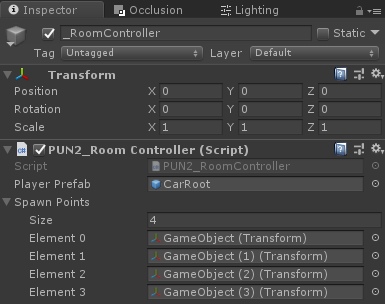 - Chỉ định một prefab Xe hơi và một SpawnPoints sau đó lưu Cảnh