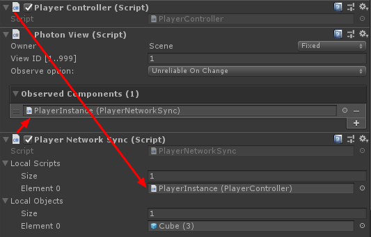 }- Thêm tập lệnh PlayerNetworkSync.cs vào PlayerInstance và gán nó cho các Thành phần được quan sát của PhotonView.