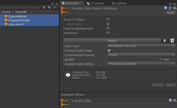 Ví dụ: trong dự án của tôi, tôi có 3 sounds với các mục đích khác nhau và như bạn có thể thấy, tất cả chúng đều có cài đặt nhập mặc định không phù hợp với mọi loại âm thanh.